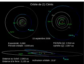 Cérès est située sur une orbite héliocentrique entre Mars et Jupiter, au sein de la ceinture d'astéroïdes principale. Sa période est de 4,6 ans. Son orbite est modérément inclinée (10,6° par rapport au plan de l'écliptique, à comparer à 7° pour Mercure et 17° pour Pluton) et faiblement excentrique (0,08, celle de Mars vaut 0,09)[33]. Les observations effectuées par Hubble en 2003-2004 permirent de déterminer que le pôle Nord de Cérès pointe (à 5° près) dans la direction d'ascension droite 19h 41m et de déclinaison +59°, dans la constellation du Dragon ; l'inclinaison de l'axe de Cérès est très faible (environ 4 ± 5 °)[2],[7].