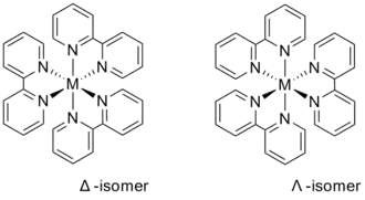 Les complexes dits « tris(bipy) », constitués de trois molécules de bipyridine chélatant un ion métallique, sont écrits [M(bipy)3]n+, où M est un ion métallique Cr, Fe, Co, Ru, Rh, etc. Ces complexes présentent des structures octaédriques de coordinence 6 avec deux énantiomères de chiralité axiale :