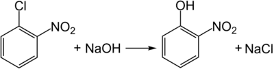 La présence d'un groupe nitro dans le noyau benzénique facilite les réactions de substitution nucléophile, mais pas au point que, par exemple, il soit facile de remplacer un atome de chlore par une solution aqueuse alcaline à pression normale. Dans des conditions plus sévères, la réaction continue avec la formation de 2-nitrophénol :