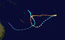 Le chemin parcouru par le cyclone Winston en février. Les quatre points rouges (intensité maximale) correspondent à son passage aux Fidji.