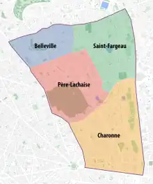 Il est limité au Sud par le cours de Vincennes, à l'Ouest par les boulevards de Charonne, de Ménilmontant et de Belleville correspondant aux anciennes limites du mur des Fermiers généraux, au Nord par la rue de Belleville et l'avenue de la Porte-des-Lilas et à l'Est par les rues des Frères-Flavien, Évariste-Galois, Pierre-Soulié, Jean-Jaurès, avenues du Professeur-André-Lemierre, Benoît-Frachon, Léon-Gaumont, rue du Commandant-L'Herminier et l'avenue de la Porte-de-Vincennes.