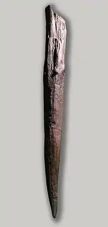 - Entre 420 000 et 360 000 ans AP : un épieu (en) trouvé en 1911 à Clacton-on-Sea, en Angleterre[12], est l'un des plus anciens outils en bois connus[13].