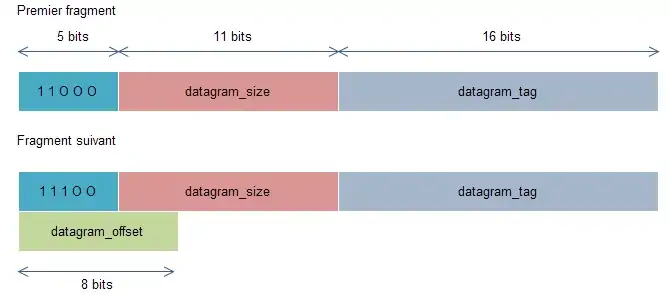 - 5 bits pour dispatch : permet d’identifier qu’il s’agit d’un fragment. Le premier fragment aura la valeur « 11000 » et les suivants « 11100 » ;
