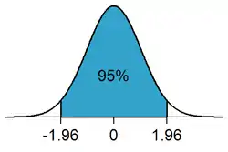 En probabilités et en statistiques, le 97,5e centile de la distribution normale standard est un nombre couramment utilisé. La valeur approximative de ce nombre est de 1,96, ce qui signifie que 95 % de l'aire sous une courbe normale se situe à environ 1,96 écart-type de la moyenne. En raison du théorème central limite, ce nombre est utilisé dans la construction d'intervalles de confiance d'environ 95 %. Son omniprésence est due à la convention arbitraire mais courante en statistiques scientifiques et fréquentistes, consistant à utiliser des intervalles de confiance avec une probabilité de 95 %[1],[2]. Bien que d'autres conventions existent, celle-ci semble particulièrement courante dans les statistiques médicales[3], et dans d'autres domaines d'application, tels que les sciences de la terre, les sciences sociales et la recherche commerciale.