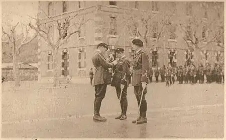 Remise de l'insigne d'éclaireur-skieur au capitaine Trastour par le chef de bataillon Vautrin le 25 février 1939