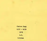 A.D. Coleman fit un bon nombre d’essais photographiques. Carbon Copy en 1973 fut l’un d’eux. Ce livre fut un test d’expérimentation sur la nouvelle technologie dans l’image. Il utilisa la machine Xerox Haloid afin de documenter son corps, son organisme en bits numériques, de texture dans une performance d’image au travers un livre d’artiste[2].