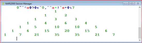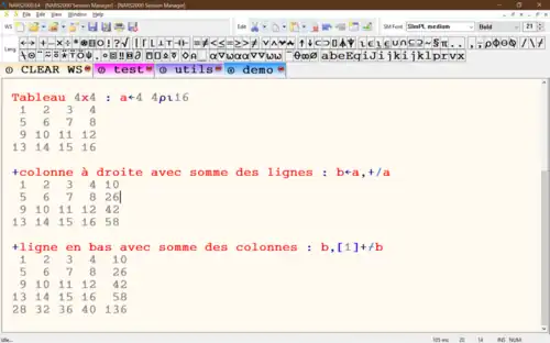 Les exemples sont donnés en double : une forme de copie d'écran dont le rendu sera correct quel que soit le navigateur que vous employez, et une en forme de texte que vous pouvez copier/coller par exemple dans NARS2000 (voir plus bas) pour l'exécuter, éventuellement avec quelques variantes. Le rendu de la page dépendra de votre police et de votre niveau de zoom par défaut. Vous pouvez les modifier, par exemple sur un PC par Ctrl+molette de la souris, en fonction de la résolution de votre écran.