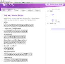 - TryAPL2 pour Android, avec un clavier virtuel tactile dans le Play Store https://play.google.com/store/apps/details?id=gemesys.keybrd