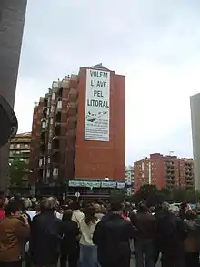 Panneau géant devant la Gare de Sants, à l'encontre du tracé de l'AVE par le centre de la ville de Barcelone.