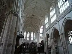 Les voûtes reposent sur des piliers cylindriques avec quatre colonnes engagées. La décoration des nervures, des clefs de voûte et des chapiteaux est faite d’une profusion de feuillage enroulé où l’on distingue, varech, feuilles d’érable, de vigne, de houblon, de chêne, de chardon etc.