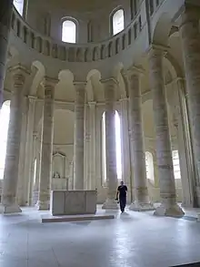 Les premiers prisonniers arrivent dès 1812. La prison est officiellement ouverte le 3 août 1814, employant alors une vingtaine de personnes[58]. En 1817, Fontevraud devient une maison centrale pour dix-neuf départements. De nouveaux aménagements sont nécessaires. En 1821, l'architecte Durand est nommé à l'ancienne abbaye. Afin de gagner un maximum de place, il supprime un grand nombre de cloisons et cherche à multiplier les étages, notamment dans la nef de l'abbatiale. Les coupoles de celle-ci sont alors rasées pour aménager les combles en 1825. L'aile nord du cloître se voit adjoindre un étage supplémentaire et le réfectoire se voit ajouter un plancher[59].