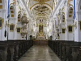Au XVIIIe siècle l'abbaye d'Elchingen atteint son apogée. En 1715, elle comptait quarante-deux membres. Ils se consacrent aux œuvres, au pèlerinage à la Mater Dolorosa d'Elchingen, à l'enseignement et aux sciences. L'église est remaniée en 1746, des chapelles latérales sont ajoutées de chaque côté de la nef et l'intérieur est modernisé dans le style rococo. L'église abbatiale est détruite par la foudre en 1773, puis reconstruite dans le style architectural du début du classicisme. La construction est conçue par l'architecte Joseph Dossenberger (1720-1785), disciple de Dominikus Zimmermann. Le mobilier de la nef et les fresques du plafond avec des scènes de la vie de Marie et de saint Benoît sont réalisées par Januarius Zick (1730-1797), peintre de la cour de Trêves.