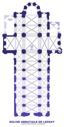 La nef de sept travées a des bas-côtés voûtés d'arêtes séparés par des doubleaux en plein cintre qui sont éclairés par des fenêtres. L'abbaye reprend le plan bénédictin adopté à Bernay avec la nef à trois élévations : arcades, tribunes et fenêtres hautes[33]. En élévation, elle a trois niveaux avec des tribunes peu élevées, avec des ouvertures étroites groupées par deux[34], et un troisième niveau de fenêtres sur l'extérieur avec de petits contreforts. Le transept, encadré par quatre arcs en plein cintre est voûté d'ogives comme les croisillons et porte la tour de plan carré. Dans le croisillon ouest, une tourelle d'escalier permet l'accès à la galerie de circulation et aux combles. Le transept est prolongé d'un chevet avec une abside et un cul-de-four. On trouve un tracé régulateur : le transept et ses croisillons, la tour sont inscrits dans un carré.