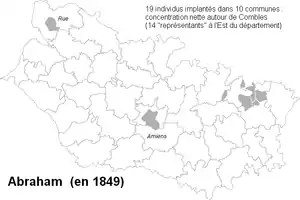 - Répartition par départements (France, 1891-1990) du patronyme « Abraham » fournie par l’Insee et présentée par le site Géopatronyme