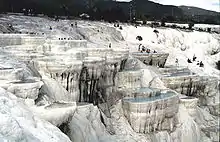 L'érosion a érodé les corniches à travertin, qui sont tombées et ne forment presque plus d'abris, et a accumulé des matériaux sédimentaires sur le versant de falaise. Au Quaternaire, des mouvements gravitationnels, ou mouvements relictuels, ont provoqué la chute des corniches qui ont pris l'aspect documenté au début du XXe siècle.