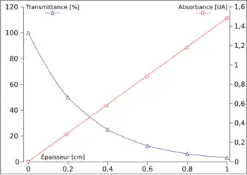 Supposons qu'une substance, d'un centimètre d'épaisseur permet à 50 % de l'énergie reçue de la traverser. Autrement dit, sa transmittance vaut 0,5. Si cette lumière obtenue passe par une deuxième couche de même épaisseur, une nouvelle fois seuls 50 % de celle-ci réussiront à passer à travers. Au passage successif par les deux couches, seulement 25 % de l'énergie de la lumière incidente ont été transmis par 2 cm de cette substance (0,5 x 0,5 = 0,52 = 0,25). De même, 3 cm transmettront 12,5 % du total reçu (0,5 x 0,5 x 0,5 = 0,53 = 0,125). Il s'agit donc là d'une progression géométrique : la transmittance ne diminue donc pas d'une manière linéaire quand l'épaisseur augmente, mais exponentielle (voir figure). En conséquence, le logarithme de T (log T) diminue linéairement en fonction de l'épaisseur[alpha 1].