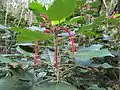 C'est une plante arbustive qui peut atteindre 1,5 m à 3,7 m de hauteur. Elle peut être cultivée à partir de graines ainsi que de boutures, comme plante d'extérieur ou comme plante d'intérieur. Toutes les parties de la plante sont toxiques. La plante est dioïque, et il y a donc des individus monosexués. La plante femelle porte des fleurs pistillées de 0,7 millimètre de long, de couleur violette à rouge vif, et poussant en grappes le long des chatons. Les pistils croissent toute l'année, tant que les températures sont favorables. C'est un arbuste dressé aux feuilles grandes, ovales et de couleur vert brillant à cuivré.