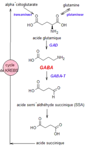 Les métabolismes du GABA et du glutamate (ou acide glutamique) sont intimement liés. Le glutamate vient lui-même de la glutamine et de l'alpha-cétoglutarate, issu du cycle de Krebs (voir figure 1). Le glutamate est ensuite décarboxylé en GABA sous l'influence de la glutamate-décarboxylase (GAD) et de son cofacteur, le phosphate de pyridoxal, dérivé de la vitamine B6.