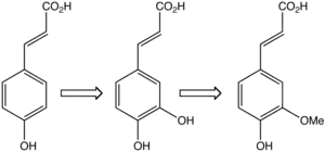 Dans les plantes, l'acide caféique (milieu) est formé par hydroxylation de l'acide paracoumarique (gauche) et transformé en acide férulique (droite).