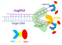 Pour surmonter la limitation du système d'activation du gène dCas9-VP64, le système dCas9-SAM a été développé pour incorporer plusieurs facteurs transcriptionnels. Utilisant les protéines MS2, p65 et HSF1, le système dCas9-SAM recrute divers facteurs transcriptionnels travaillant en synergie pour activer le gène d'intérêt. Afin d'assembler différents activateurs transcriptionnels, le système dCas9-SAM utilise un ARN guide unique modifié (sgRNA) qui possède des sites de liaison pour la protéine MS2. Les aptamères en épingle à cheveux sont attachés à la boucle tétra et à la tige-boucle 2 de l'ARNsg pour devenir des sites de liaison pour les protéines d'enveloppe dimérisées du bactériophage MS2. Comme les aptamères en épingles à cheveux sont exposées à l'extérieur du complexe dCas9-sgRNA, d'autres facteurs transcriptionnels peuvent se lier à la protéine MS2 sans perturber le complexe dCas9-sgRNA. Ainsi, la protéine MS2 est conçue pour inclure les protéines p65 et HSF1. La protéine de fusion MS2-p65-HSF1 interagit avec le dCas9-VP64 pour recruter plus de facteurs de transcription sur le promoteur des gènes cibles.