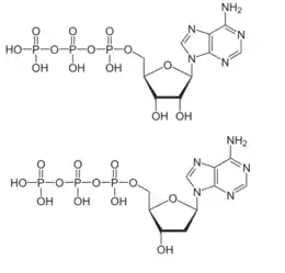 Structures comparées de l'ATP (en haut) et du dATP (en bas).