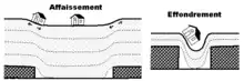 L'effondrement est au contraire plus rapide, voire brutal. Il se traduit en surface par une variation instantanée de la topographie locale (cuvette d’affaissement), voire — lorsque la profondeur de l’excavation est faible relativement à son épaisseur — à un trou béant en surface qualifié de « fontis » (à ne pas confondre avec les dolines qui sont dues à un phénomène naturel de dissolution karstique).