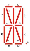 Il s'agit d'une extension de l'affichage à sept segments, plus courant. Comparativement à l'affichage à sept segments, l'affichage à seize segments ajoute quatre segments diagonaux et deux segments verticaux et divise les trois segments horizontaux en deux.