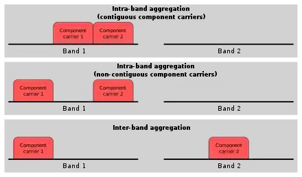 En LTE Advanced et en 5G, les porteuses agrégées peuvent être situées dans des bandes de fréquence différentes (CA inter-bande)[4] ou dans la même bande de fréquence, l’une à côté de l'autre (CA intra-bande, porteuses contiguës) ou encore dans la même bande de fréquences mais avec un espace entre les fréquences des porteuses agrégées[5].