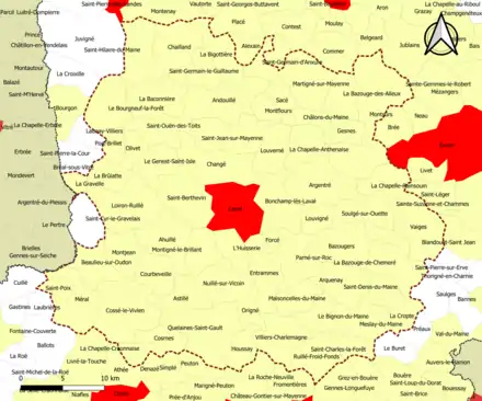 Localisation de l'aire d'attraction de Laval dans le département de la Mayenne. | |