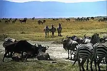 Ces mammifères sont surtout représentés par des ongulés comme le rhinocéros noir, l'éléphant, le Redunca fulvorufula (Cobe de montagne), le buffle, l'hippopotame, le gnou, le zèbre, l'éland, la gazelle de Grant et la gazelle de Thomson mais aussi par les prédateurs qui les suivent. Ainsi, le cratère du Ngorongoro abrite de nombreux léopards, chacals, hyènes, chats dorés africains, guépards et la plus forte concentration de lions d'Afrique tandis que les lycaons se font de plus en plus rares.