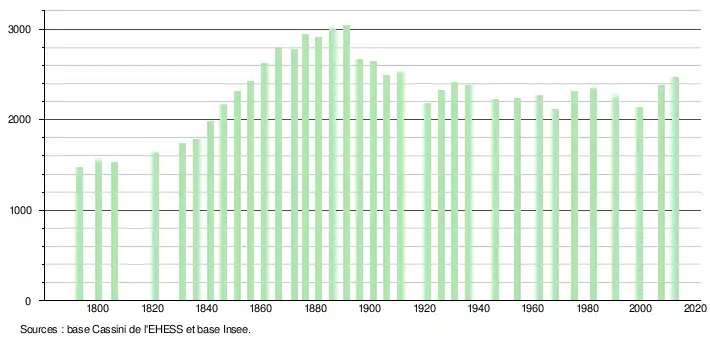 L'évolution du nombre d'habitants est connue à travers les recensements de la population effectués dans la commune depuis 1793. À partir du , les populations légales des communes sont publiées annuellement dans le cadre d'un recensement qui repose désormais sur une collecte d'information annuelle, concernant successivement tous les territoires communaux au cours d'une période de cinq ans. Pour les communes de moins de 10 000 habitants, une enquête de recensement portant sur toute la population est réalisée tous les cinq ans, les populations légales des années intermédiaires étant quant à elles estimées par interpolation ou extrapolation[10]. Pour la commune, le premier recensement exhaustif entrant dans le cadre du nouveau dispositif a été réalisé en 2007[11],[Note 1].