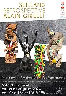 Juillet 2023 Alain Girelli propose une exposition rétrospective peinture, sculpture, performance organisée par la ville de Seillans[35]. Cette exposition s'est faite en présence du maire de Seillans (René Ugo) et président du pays de Fayence. L'inspiration de l'exposition s'est faite d'après le texte "LES MYSTÈRES DE LA FORÊT"1934 de Max ERNST " A quoi servent les forêts ?". La vidéo du vernissage se trouve ici.