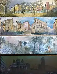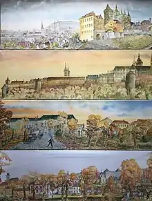 Aleš Jiránek (né à Prague en République tchèque en 1947) est un peintre, auteur d'œuvres liées à des villes. Il réalise des tableaux de rues, de places, d'allées, dans un style très particulier. Bâtiments et maisons sont généralement étirés comme par un objectif grand angle et les couleurs sont vives. Il a mis au point cette technique qu'il appelle la perspective mobile. Elle fonctionne comme une caméra qui se promène librement dans l'espace.