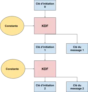 Comme indiqué précédemment, la dérivation de clé fonctionne sous forme de chaîne[4]. On part d'une clé secrète partagée et d'une entrée (un sel ou un poivre) qu'on fournit à la fonction de dérivation. Celle-ci fournit deux nouvelles clés : une clé de chiffrement ou déchiffrement pour le prochain message, et une clé d'initiation pour la fonction de dérivation KDF.
