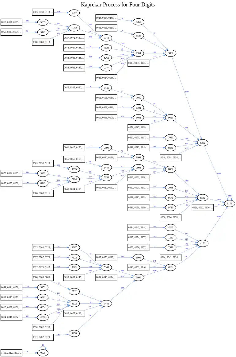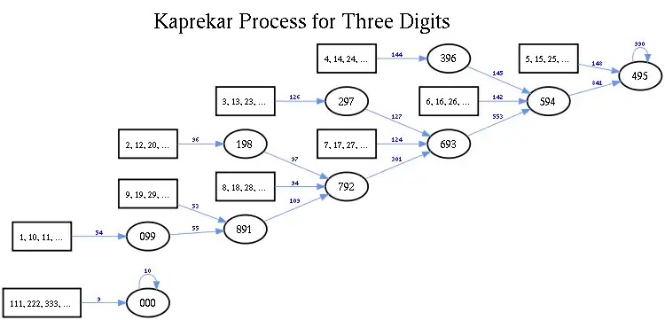 - le nombre constant zéro, y compris dans les « cas dégénérés » où tous les chiffres du nombre initial sont égaux (c'est-à-dire le cas du nombre initial 0 et les 9 cas de nombres décimaux initiaux ayant un nombre donné de chiffres tous identiques et non nuls), ainsi que (plus généralement) ceux dont les chiffres sont déjà ordonnés du plus grand au plus petit (mais peuvent être répétés) ; cependant, Kaprekar lui-même excluait du comptage des cas les nombres ayant des chiffres initiaux nuls (qui ne sont alors pas réordonnés comme chiffres finaux dans le nombre n2 de l'algorithme de définition), ce qui réduit les cas dégénérés aux seuls cas du nombre zéro lui-même et des nombres formés de chiffres identiques non nuls ;