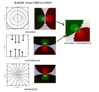 Dans l'image à droite, il y a à gauche une série de diagrammes des vecteurs du vent dans les cas de rotation, converge et divergence. À droite de l'image, c'est ce que le radar peut voir de la composante radiale, s'il est placé en bas de l'image, avec le vert correspondant à la composante vers le radar et le rouge, celle s'en éloignant.