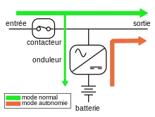 - L'onduleur est en série entre le réseau et la charge. La puissance fournie à la charge transite en permanence par le duo chargeur-onduleur qui réalise une double conversion alternatif/continu - continu/alternatif.