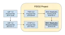 La norme U2F 1.0 (octobre 9, 2014) est le point de départ d'une spécification éphémère connue sous le nom de FIDO 2.0 (septembre 4, 2015). Cette dernier a été officiellement soumis au World Wide Web Consortium (W3C) en novembre 12, 2015[5]. Par la suite, le premier projet de travail de la norme d'authentification Web du W3C (WebAuthn) a été publié en mai 31, 2016. La norme WebAuthn a été révisée à plusieurs reprises depuis lors, devenant une recommandation du W3C en mars 4, 2019.