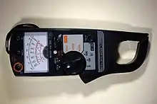- la pince ampèremétrique à capteur de courant à effet Hall permet de mesurer des courants quelconques (alternatifs ou continus) et d'intensité élevée sans s'insérer dans le circuit ni l'interrompre. La pince est composée d'un circuit magnétique (un transformateur d'intensité) qui se referme sur une pastille semi-conductrice. Cette pastille va être soumise à l'induction générée par le fil (courant à mesurer)[5],[6],[7]. On mesure l'induction car celle-ci a l'avantage d'exister quel que soit le type de courant. La pastille semi-conductrice est soumise à un courant perpendiculaire à l'induction qui la traverse[5],[6],[7]. Tout ceci pour provoquer grâce à la force de Lorentz un déplacement de charge dans la pastille qui va entrainer une différence de potentiel qui est proportionnelle au champ et donc au courant, un système de contre-réaction impose au transformateur de fonctionner à flux nul et c'est le courant d'annulation du flux qui, converti en tension à l'aide d'un convertisseur à amplificateur opérationnel, donne à sa sortie une tension image du courant mesuré[5],[6],[7] ;