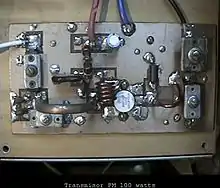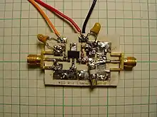 Les amplificateurs de puissance RF modernes utilisent des dispositifs à semi-conducteurs, principalement des MOSFET (transistors à effet de champ métal-oxyde-semi-conducteur)[3],[4],[5]. Les premiers amplificateurs RF basés sur MOSFET remontent au milieu des années 1960[6]. Les transistors à jonction bipolaire étaient également couramment utilisés dans le passé, jusqu'à ce qu'ils soient remplacés par des MOSFET de puissance, en particulier des transistors LDMOS, comme technologie standard pour les amplificateurs de puissance RF dans les années 1990, en raison des performances RF supérieures des transistors LDMOS.
