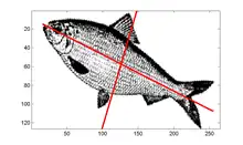 On considère un objet en trois dimensions et on cherche à le représenter par projection au mieux en deux dimensions. L'ACP va alors déterminer les deux axes de projection qui expliquent le mieux la dispersion de l'objet, autrement dit l'inertie du nuage des points qui le compose. Ainsi, comme dans la figure ci-contre, la projection des points du poisson en 3D sur le plan 2D formé par ces deux axes respectera au mieux la forme du nuage de point initial. En d'autres termes, il s'agit de trouver le plan de projection sur lequel la forme du poisson sera la plus étendue et reconnaissable possible.