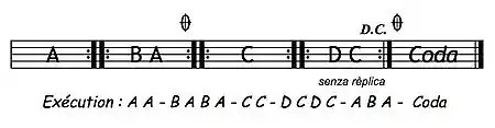- une phrase C de 8 ou 16 mesures, dans un ton voisin, reprise une fois ;