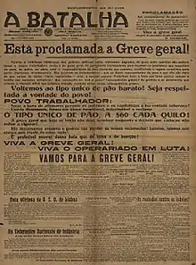 - Fondé le , A Batalha (pt), est un journal quotidien, porte-voix de la CGT. Dans les années 1920, c'est le troisième titre de presse en termes de diffusion. Pendant la Première République, il est régulièrement suspendu et son imprimerie de la Calçada do Combro, à Lisbonne, attaquée par la police. À la suite du coup d'État du , la CGT et le journal sont interdits. Le dernier numéro sort le , lorsque ses installations sont définitivement détruites par la police. Après le , un groupe de vieux militants anarcho-syndicalistes reprend la publication avec la mention A Batalha - Jornal Anarquista[14].