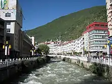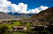 ∗ La branche sud passe par Litang 理塘, une bourgade perdue à plus de 4 000 mètres d'altitude où vivent actuellement 47 500 habitants (en 2001), et qui déjà en 1810, comportait une population non religieuse de 5 320 familles et dont les 45 bâtiments monacaux abritaient 3 270 moines. Surplombant la ville, se trouve le plus grand monastère de l'école Gelugpa du Kham, nommé Thupten Jampaling. Construit en 1560 par le troisième dalaï-lama, il hébergeait plusieurs milliers de moines[23] avant 1950 et comme tous les grands monastères tibétains, il imprimait des livres, rendait la justice, faisait du commerce et au besoin lançait des opérations armées. À l'époque de l'ancien Tibet, les monastères contrôlaient l'économie et le gouvernement du pays, possédaient un tiers des terres cultivables, beaucoup de pâturages, et un grand nombre de serfs et d'esclaves (Ma[28], 1995). L'ensemble des institutions religieuses, monastères et Potala, collectaient la majorité des richesses produites (revenus et taxes, aides du gouvernement et dons des pèlerins) qu'ils dépensaient en grande partie dans leurs activités religieuses.
