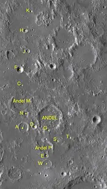 Les cratères dits satellites sont de petits cratères situés à proximité du cratère principal, ils sont nommés du même nom mais accompagné d'une lettre majuscule complémentaire (même si la formation de ces cratères est indépendante de la formation du cratère principal). Par convention, ces caractéristiques sont indiquées sur les cartes lunaires en plaçant la lettre sur le point le plus proche du cratère principal. Liste des cratères satellites de Andel[5] :