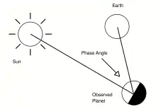 On a d'abord parlé de l'angle de phase de la Lune, observée depuis la Terre et éclairée par le Soleil. Le mot phase montre la référence aux phases de la Lune. De la Terre, nous ne pouvons voir éclairées par le Soleil sous tous les angles de phases que la Lune, Mercure et Vénus. L'angle de phase maximal des autres planètes est d'autant plus faibles que leur distance au Soleil est plus grande; pour Mars il est de 45°.