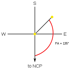 Comme le montre le schéma, si on observe une étoile binaire ayant un angle de position de 135 degrés, cela signifie que, dans l'oculaire, une ligne imaginaire allant de la primaire (P) vers le pôle nord céleste (NCP) serait écartée de la secondaire (S) tel que l'angle NCP-P-S soit égal à 135 degrés.