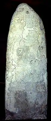 À Tikal, la stèle 31 érigée en 445 présente trois figures : au centre, Ciel d’Orage, souverain de Tikal en 435, entouré de guerriers de Teotihuacán qui portent des boucliers décorés du visage de Tlaloc[1].