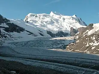 Vue depuis le nord du Grand Combin dominant le glacier de Corbassière en Suisse avec le sommet principal, le Combin de Grafeneire à 4 314 mètres d'altitude au centre, entouré de deux de ses nombreuses antécimes : le Combin du Valsorey à 4 186 mètres d'altitude à droite et le Combin de la Tsessette à 4 135 mètres d'altitude à gauche.