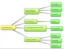 - D'autres médicaments jouent de manière non spécifique sur la cyclooxygénase (1 et 2), entraînant un effet antiagrégant mais aussi d'autres effets (par l'intermédiaire de la cyclooxygénase 2), ce qui fait qu'ils ne sont pas utilisés dans ce cadre. Ce sont en particulier les anti-inflammatoires non stéroïdiens.